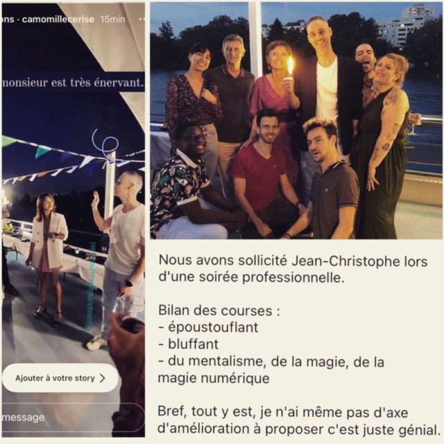 Animation professionnelle lors de la soirée de la société Embarq sur le bateau « Le Bellona » à Lyon. Au programme magie, démonstrations de triche, mentalisme et magie numérique – digitale lors du cocktail dinatoire.