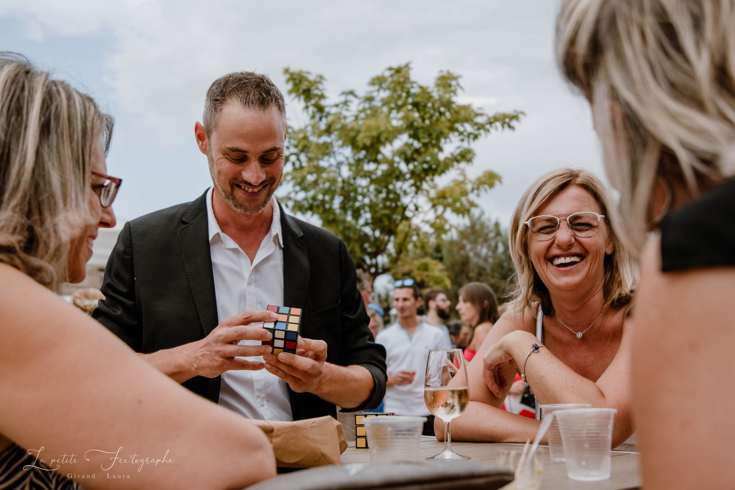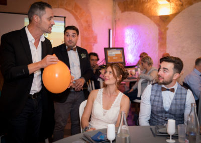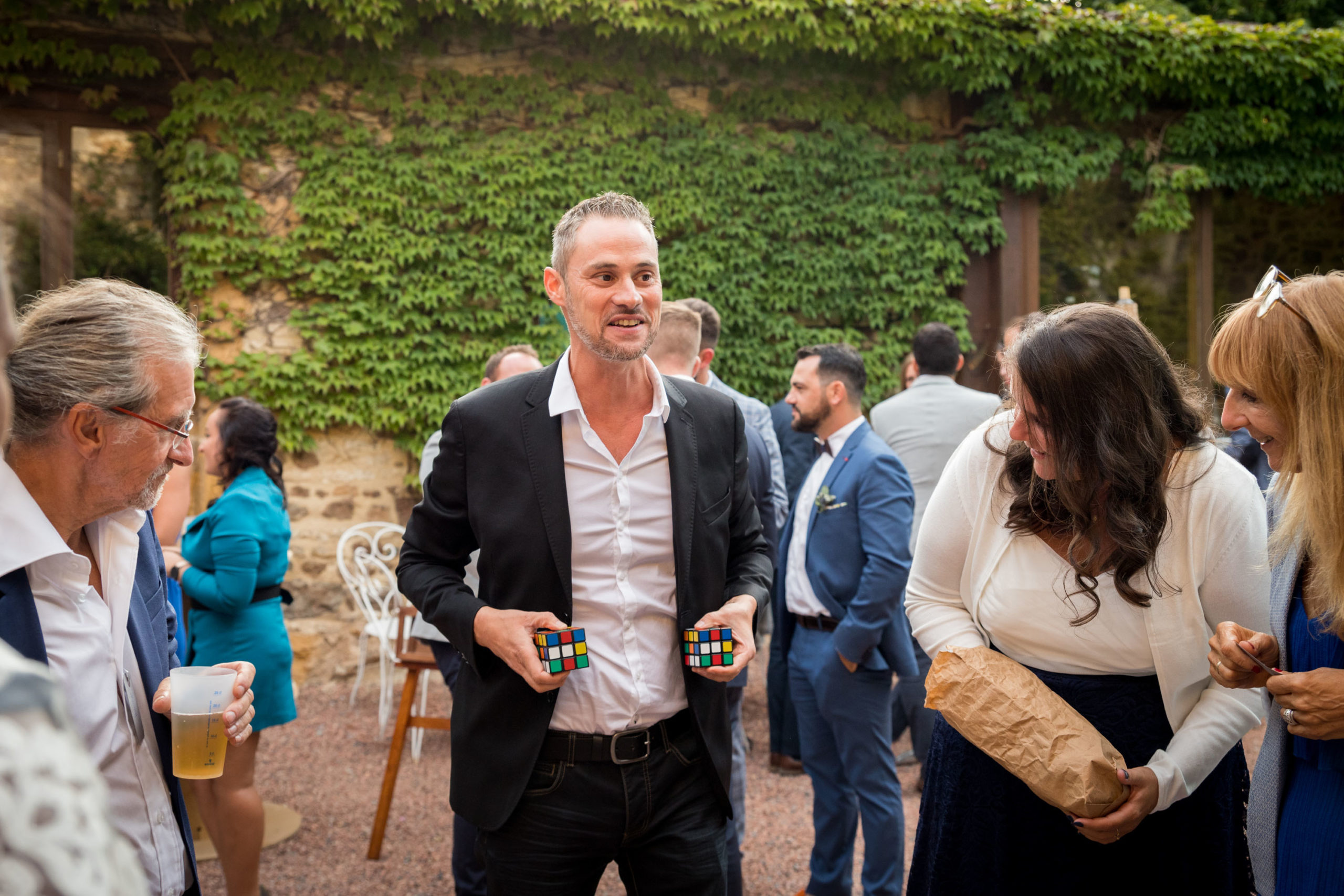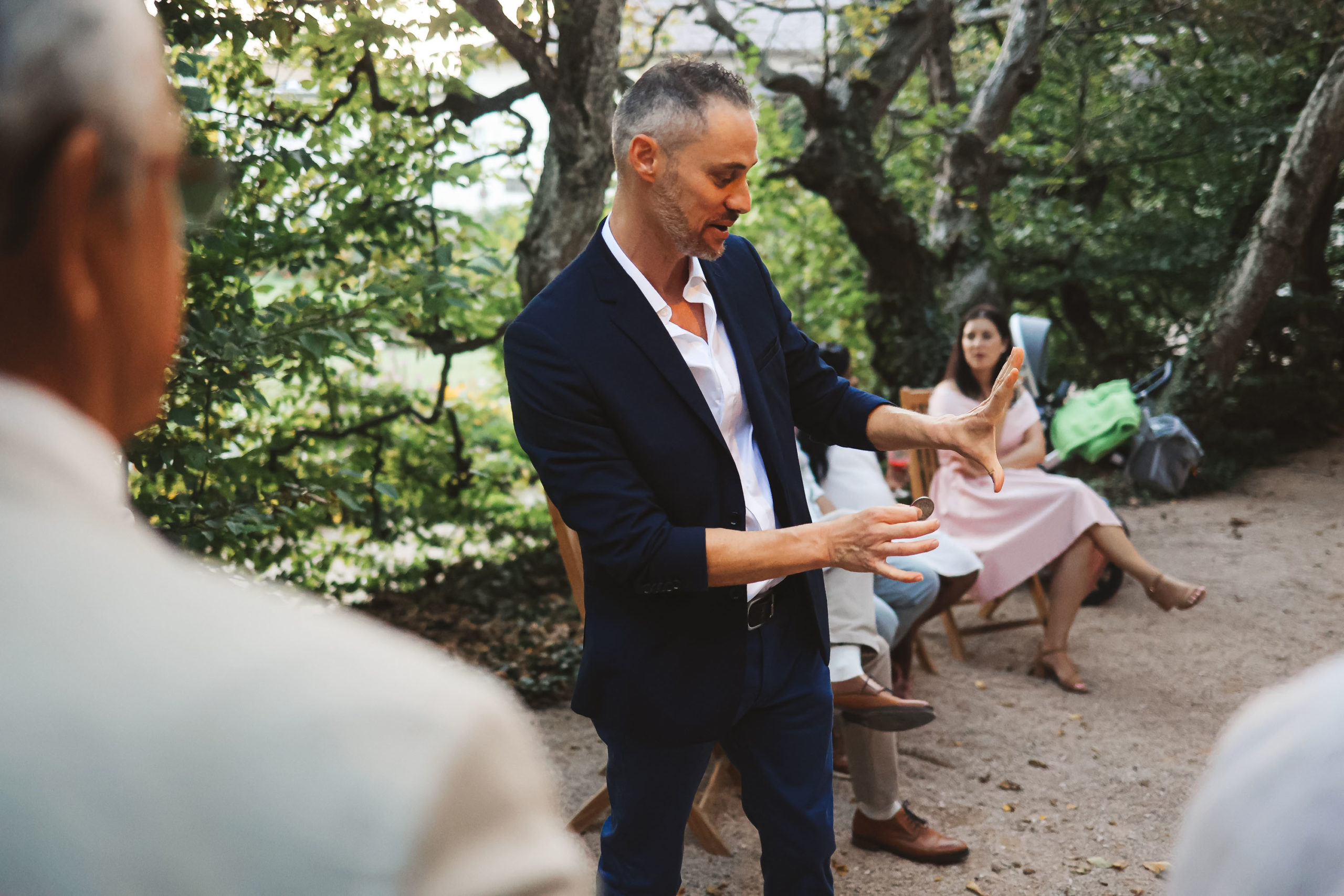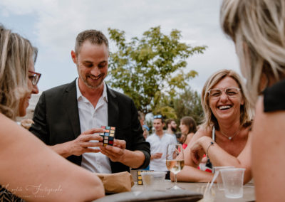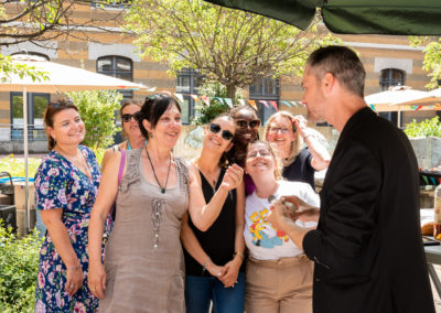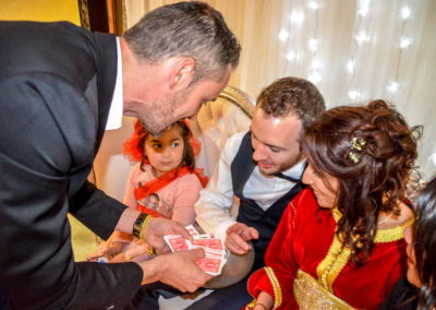 L’objectif est d’établir un lien entre vos convives et de créer une ambiance détendue. Les gens s’amusent, participent et en parlent entre eux après mon passage. Je passe de groupe en groupe afin d’offrir un spectacle particulier.