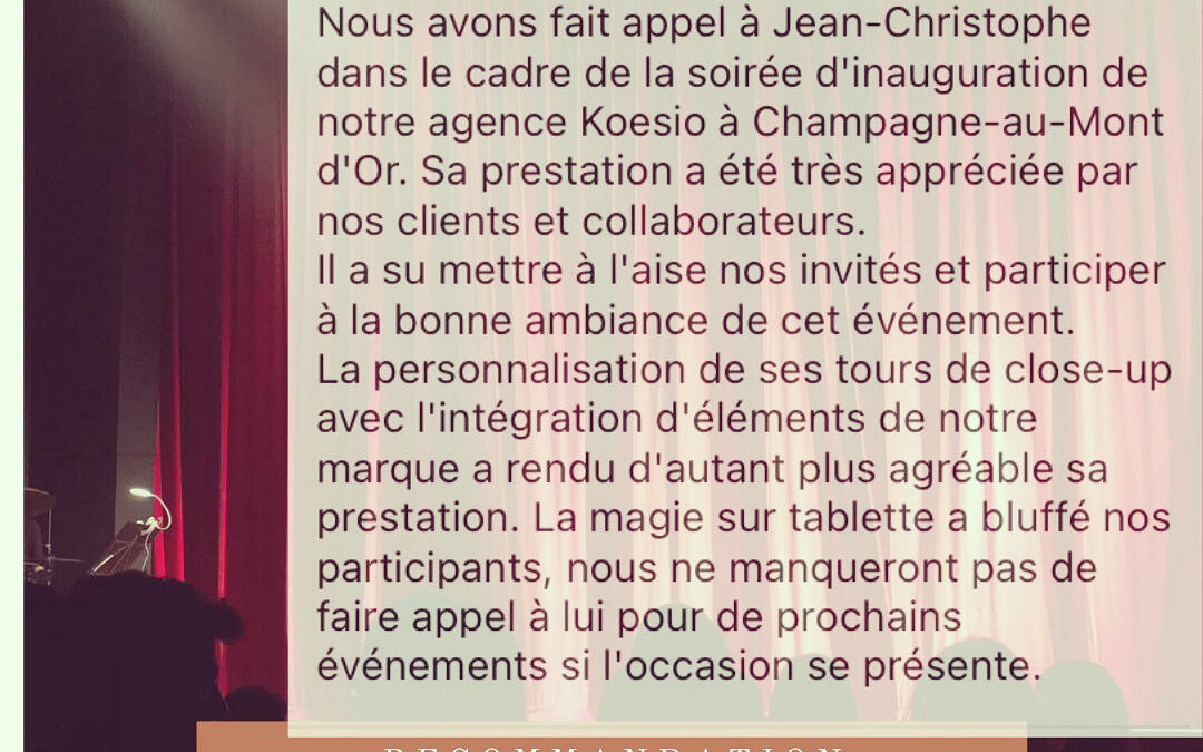 Voici une nouvelle recommandation sur Linkedin suite à une prestation sur mesure pour la société Koésio. J’ai pour l’occasion personnalisé des expériences magiques sur des outils numériques, (tablette, mobile). Koésio étant une société de services numériques, souhaitait une prestation magique, innovante et digitale. J’ai pu intégrer le logo de l’entreprise dans mes performances, mais aussi utiliser les devises de l’entreprise pour mettre en avant les effets magiques.