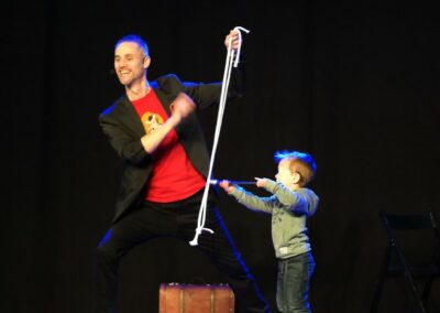 Un spectacle familial où les enfants sont acteurs des expériences magiques. Numéros visuels et tours de magie interactifs s’alternent sur un rythme dynamique. Apparitions, disparitions, surprises, gags et même suspension dans les airs d’un enfant du public.