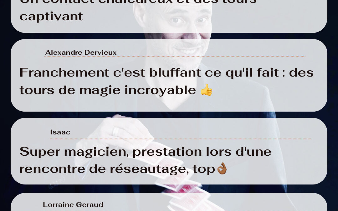 Voici des nouveaux commentaires sur Google avec des avis 5 étoiles, suite à une animation professionnelle pour une soirée d’entreprises. Au programme : magie démabulatoire, mentalisme et magie numérique. Vous trouverez tous mes nouveaux avis sur ma fiche...